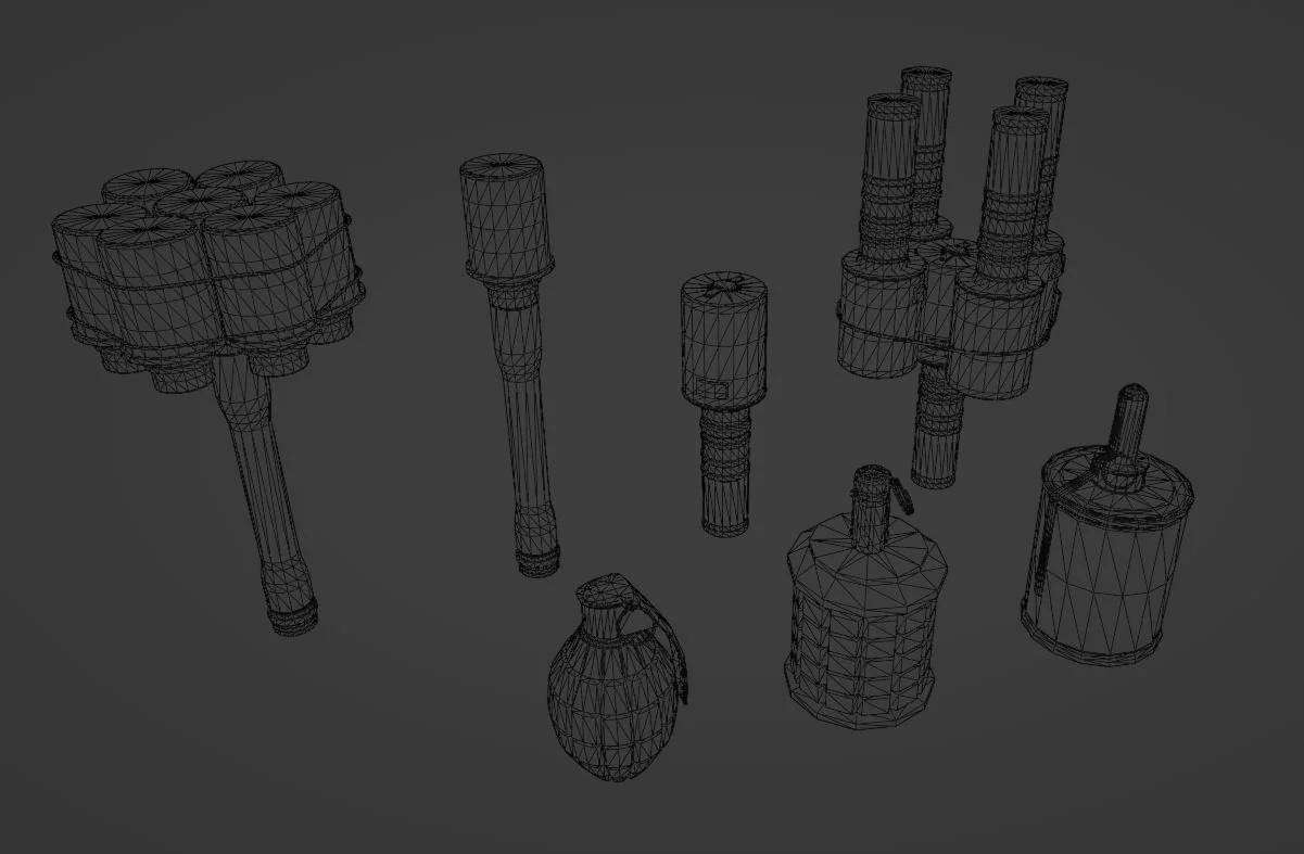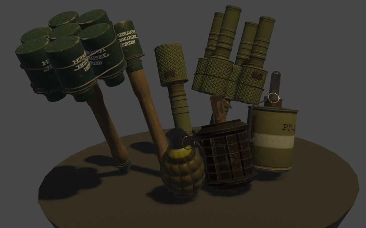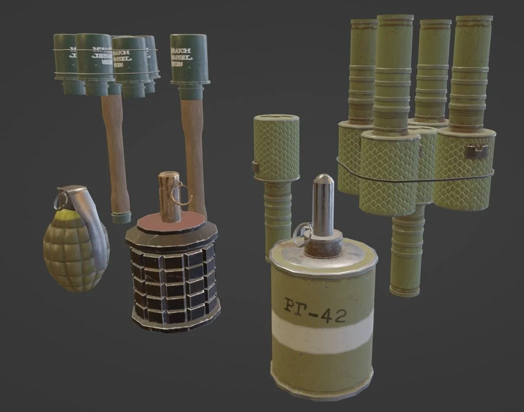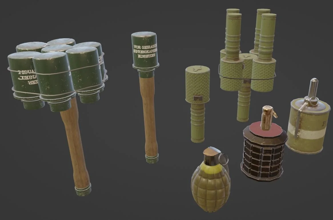 Pack includes 7 models of grenades from WW2 it includes Stielhandgranate + Anti tank bundle, RGD-33 + Anti tank bundle, RG42, TYPE 97, MK2
